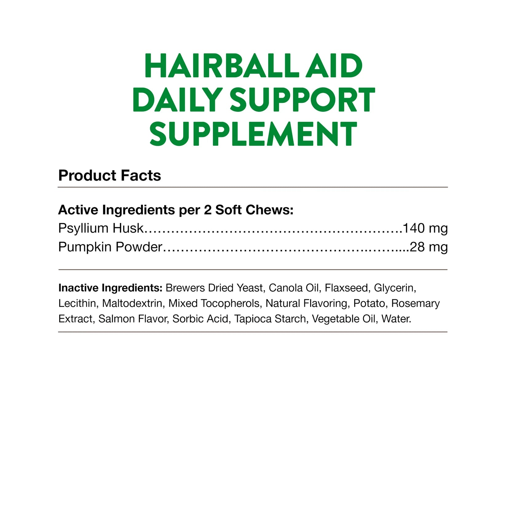 Inactive Ingredients: Brewers Dried Yeast, Canola Oil, Flaxseed, Glycerin, Lecithin, Maltodextrin, Mixed Tocopherols, Natural Flavoring, Potato, Rosemary Extract, Salmon Flavor, Sorbic Acid, Tapioca Starch, Vegetable Oil, Water